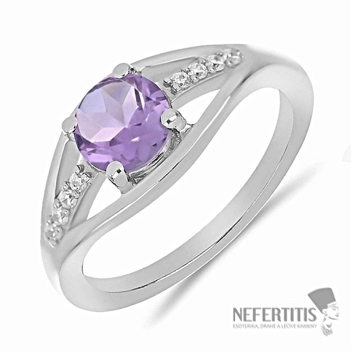 Exclusive silver ring from the designer line Nefertitis Collection with light purple cut amethyst. The amethyst is complemented by cubic zirconias for an unmistakable sparkling appearance. The stone is set in rhodium-plated silver , the surface of which resembles the appearance of white gold, giving the ring a luxurious impression. Rhodium-plated silver is less prone to oxidation (blackening) of the surface. A beautiful sparkling jewel with a clear stone of jeweller's quality, the beauty of which is emphasized by the impact of light on the individual surfaces of the cut, suitable for various occasions. Rhodium-plated silver Ag 925/1000. We deliver the jewelry in a standard paper gift box. Illustrative image.