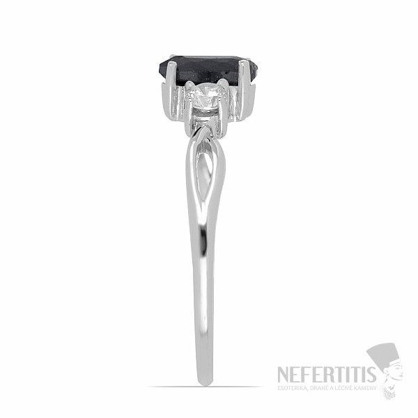 Exclusive silver ring from the Nefertitis Collection design line with natural black cut sapphire. The sapphire is complemented by cubic zircons for an unmistakable shimmering look. The stones are set in rhodium-plated silver , the surface of which resembles the appearance of white gold, so the ring creates a luxurious impression. Rhodium-plated silver is less prone to surface oxidation (blackening). A beautiful glittering jewel with a clear stone of jewelery quality, the beauty of which is emphasized by the impact of light on the individual surfaces of the cut, suitable for various occasions. Rhodium plated silver Ag 925/1000, sapphire approx. 0.8 carat. We deliver in a high-quality, attractive and elegant box in a combination of paper and suede with magnetic closure.