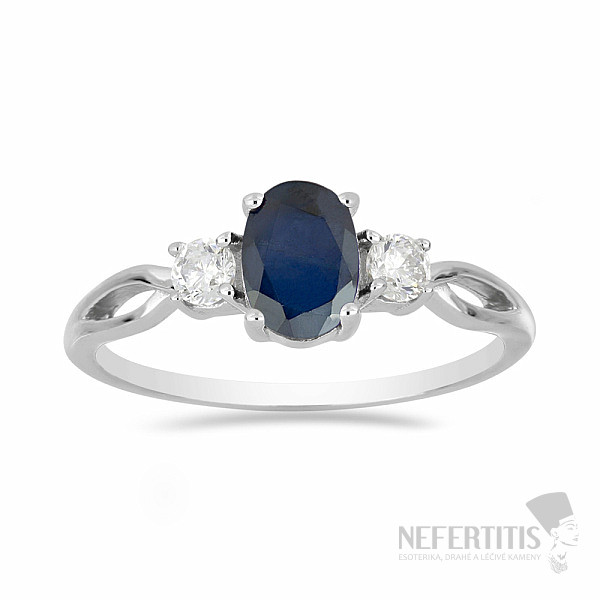 Exclusive silver ring from the Nefertitis Collection design line with natural blue cut sapphire. The sapphire is complemented by cubic zircons for an unmistakable shimmering look. The stones are set in rhodium-plated silver , the surface of which resembles the appearance of white gold, so the ring creates a luxurious impression. Rhodium-plated silver is less prone to surface oxidation (blackening). Beautiful glittering jewelry with a clear stone of jewelery quality, the beauty of which is emphasized by the impact of light on the individual surfaces of the cut, suitable for various occasions. Rhodium plated silver Ag 925/1000, sapphire approx. 0.8 carat. We deliver in a high-quality, attractive and elegant box in a combination of paper and suede with magnetic closure.
