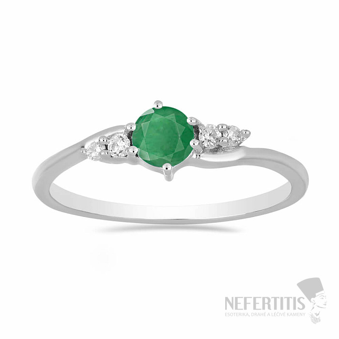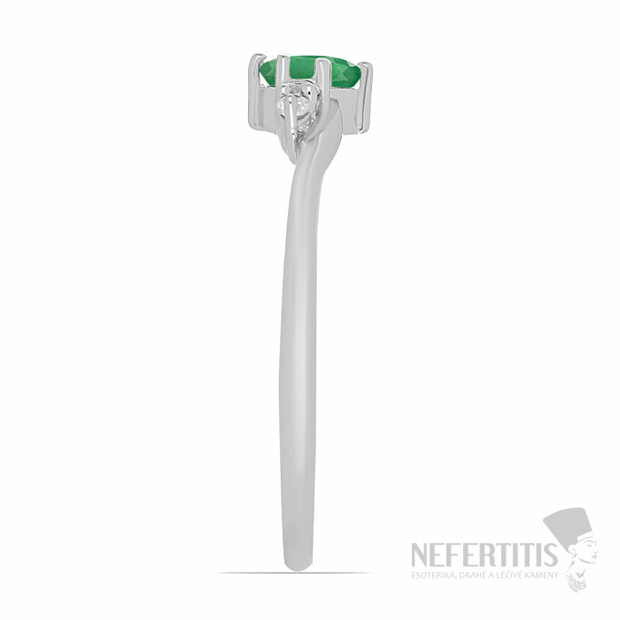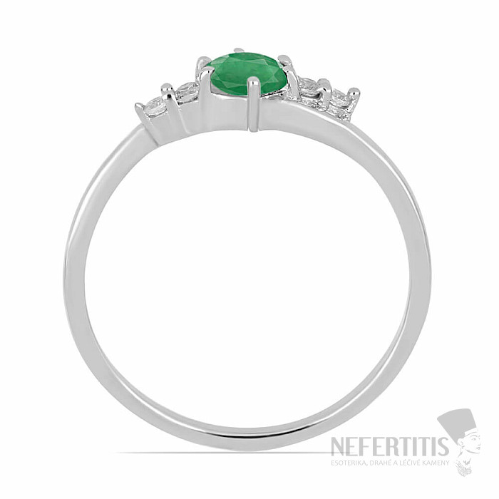 Silver ring from the Nefertitis Collection design line with a cut natural emerald and cubic zirconia. The stones are set in rhodium-plated silver, the surface of which resembles the appearance of white gold, giving the ring a luxurious impression. Rhodium-plated silver is less susceptible to oxidation (blackening) of the surface. Beautiful sparkling jewelry with a clear gem-quality stone, the beauty of which is emphasized by the light hitting the individual facets of the cut, suitable for various occasions. Rhodium-plated silver Ag 925/1000. Emerald size approx. 5 mm. Illustrative image.