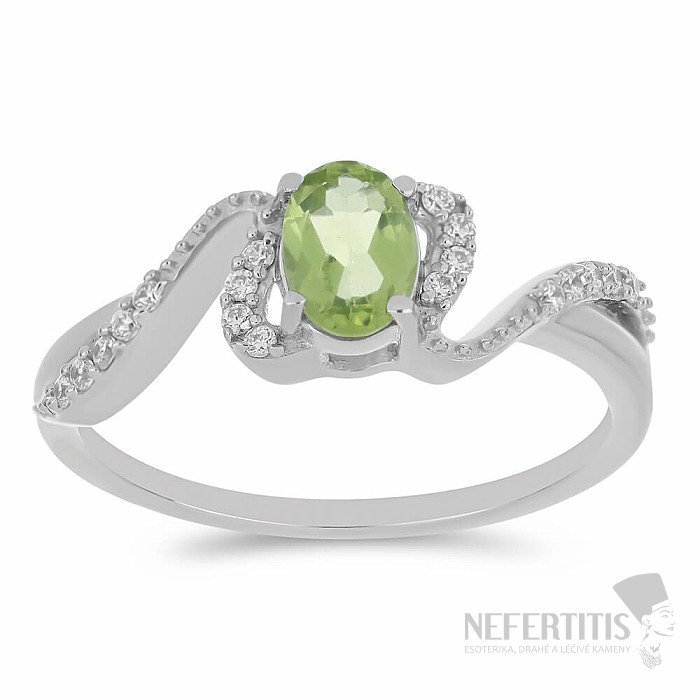 Exclusive silver ring from the designer line Nefertitis Collection with cut natural olivine. Olivine is complemented by cubic zirconia for an unmistakable sparkling appearance. The stones are set in rhodium-plated silver, the surface of which resembles the appearance of white gold, giving the ring a luxurious impression. Rhodium-plated silver is less prone to oxidation (blackening) of the surface. A beautiful sparkling jewel with a clear stone of jeweller's quality, the beauty of which is emphasized by the impact of light on the individual surfaces of the cut, suitable for various occasions. Rhodium-plated silver Ag 925/1000. We deliver the jewelry in a standard paper gift box. Illustrative image.