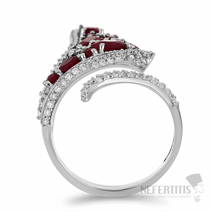 Exclusive silver ring from the designer line Nefertitis Collection with a cut natural ruby. The ruby is complemented by cubic zirconias for an unmistakable sparkling appearance. There are stones set in rhodium-plated silver , the surface of which resembles the appearance of white gold, the ring thus creates a luxurious impression. Rhodium-plated silver is less prone to oxidation (blackening) of the surface. A beautiful sparkling jewel with a clear stone of jeweller's quality, the beauty of which is emphasized by the impact of light on the individual surfaces of the cut, suitable for various occasions. Rhodium-plated silver Ag 925/1000. Total size of the ring approx. 3.5 cm. We deliver the jewelry in a standard paper gift box. Illustrative image.