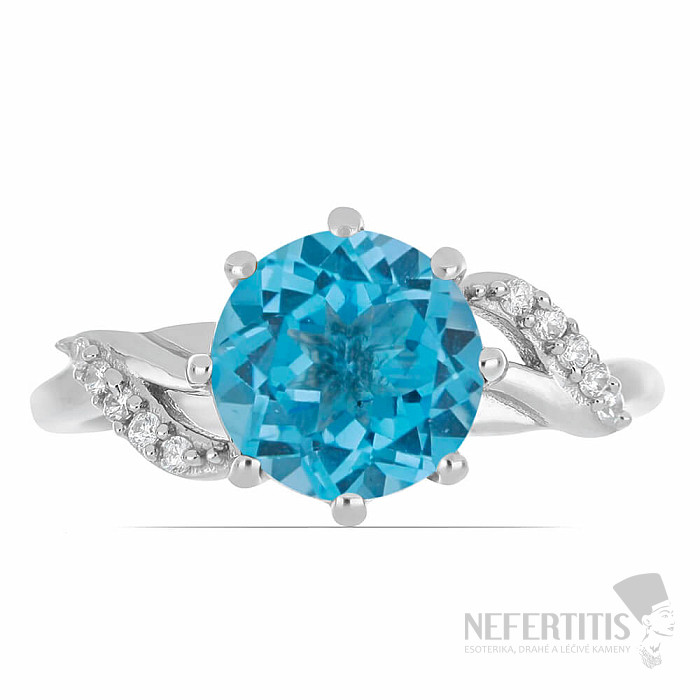 An exclusive silver ring from the Nefertitis Collection design line with a cut Swiss Blue topaz, which features a slightly darker blue than the Blue Sky topaz. Topaz is complemented by cubic zirconias for an unmistakable glittering look. The stone is set in rhodium-plated silver , the surface of which resembles the appearance of white gold, giving the ring a luxurious impression. Rhodium-plated silver is less prone to oxidation (blackening) of the surface. A beautiful sparkling jewel with a clear stone of jeweller's quality, the beauty of which is emphasized by the impact of light on the individual surfaces of the cut, suitable for various occasions. Rhodium silver Ag 925/1000. We deliver the jewelry in a standard paper gift box. Illustrative image.