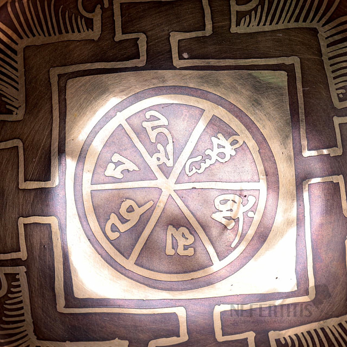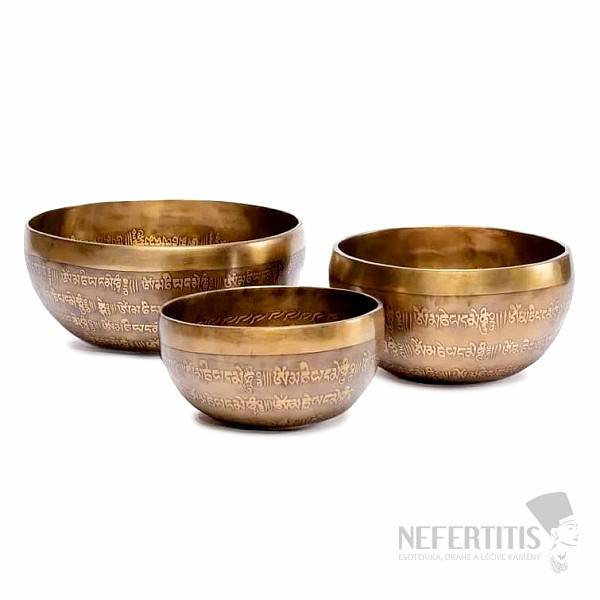 A bronze, hand-hammered, engraved Tibetan singing bowl with the Om Mani Padme Hum mantra, for calming, promoting focus and overall harmony. Material: bronze, diameter approx. 14 cm, weight approx. 550 - 700 g… more »