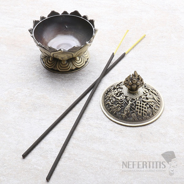 Stand for incense sticks , incense cones and frantic in the form of an elegant Tibetan metal bowl in the shape of a lotus flower with a lid decorated with Tibetan auspicious symbols. The bowl can burn incense cones and frantic, if you put a little sand or fine stones in the bowl, it can also be used as a stand for incense sticks. You will no longer have to deal with ashes scattered all around the place where you smoked the sticks, everything will fall back into the bowl, which you will cover with a lid. This bowl is not only practical for burning sticks, but it is also a very attractive decoration for your apartment or office.
