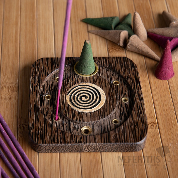 Discover the beauty of simplicity and the power of natural materials with this palm wood incense stick and cone holder . Its design is complemented by a delicate spiral , symbolizing the flow of energy, life's journey and endless movement - an ideal accessory for relaxation, meditation or aromatherapy. Illustrative image.