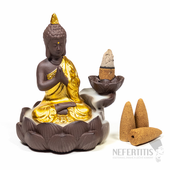 An attractive ceramic stand in the form of a Buddha statue above a lotus pond, specially designed for burning fragrant fragrant cones with the effect of so-called flowing smoke. The Buddha in Feng Shui is a symbol of happiness, wisdom, enlightenment, abundance, prosperity and brings positive energy. Size approx. 12 x 10 x 9 cm, weight approx. 300 g, material: ceramic. Scented cones are not included in the delivery. Warning: always place the stand on a suitable surface, never place it directly on furniture or other thing you care about.