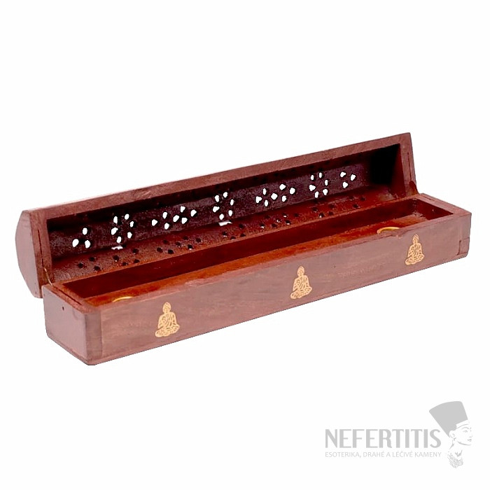 Richly carved decorative wooden box and stand at the same time for incense sticks on bamboo chips and cones. The box also serves as a storage box. It is made of wood from trees growing in India, inlaid with metal stars. The open box serves as a holder for sticks and at the same time catches fallen ashes during their burning, the lower part of the box is a storage space for sticks. When burning incense sticks, the box can be closed, with fine smoke rising through the individual holes cut. The length of the box is about 30 cm.