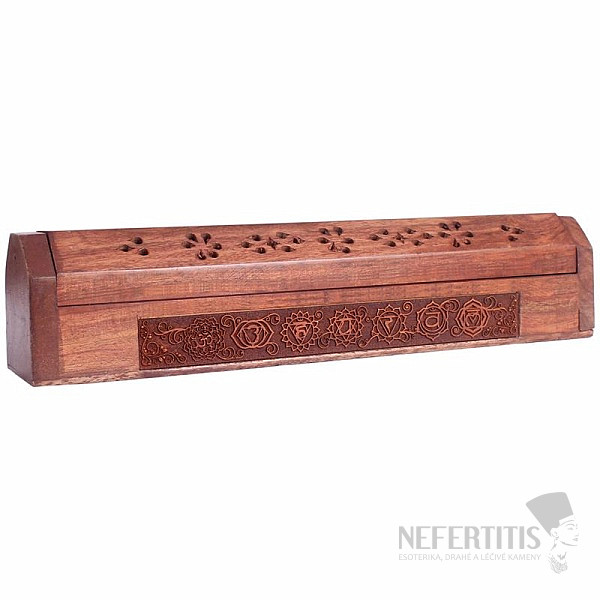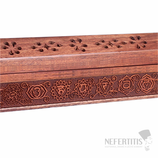 Richly carved decorative wooden box and rosewood stand at the same time for incense sticks on bamboo chips and cones. The box is decorated with chakra symbols to harmonize and recharge their energy. The box also serves as a storage box. The stand is locally hand-carved from the wood of the Indian tree Sheesham, also called Indian rosewood. The open box serves as a holder for sticks and at the same time catches fallen ashes during their burning, the lower part of the box is a storage space for sticks. When burning incense sticks, the box can be closed, with fine smoke rising through the individual holes cut. The length of the box is about 31 cm. Illustrative illustration.