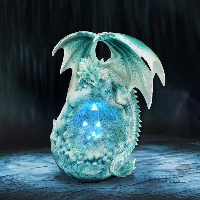 Hand-painted statuette made of high-quality polyresin. Blue dragon on an ice geode. The geode is illuminated with a gentle LED light. This beautiful statuette is not only a perfect addition to the collection of any… more »