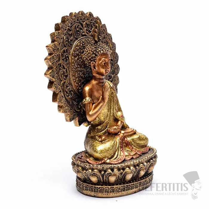 Beautiful hand colored statue of Buddha of Assurance, with Mudra Abhaja. Symbolism: The abhaja mudra is a sacred hand gesture, or seal, used during yoga practice or meditation as a means of directing the flow of life energy known as prana. It is a symbol of security, protection, peace and security. The statuette is made of polyresin, a durable resin. Dimensions : approx. 8 x 12.8 x 18.5 cm. The statuette is designed for indoor use. Illustrative illustration.