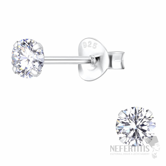 These delicate silver stud earrings are made of 925/1000 sterling silver and set with round clear zircons with a diameter of 4 mm. Their weight is 0.53 g, which makes them a light and comfortable piece of jewelry for everyday wear. Stud fastening.