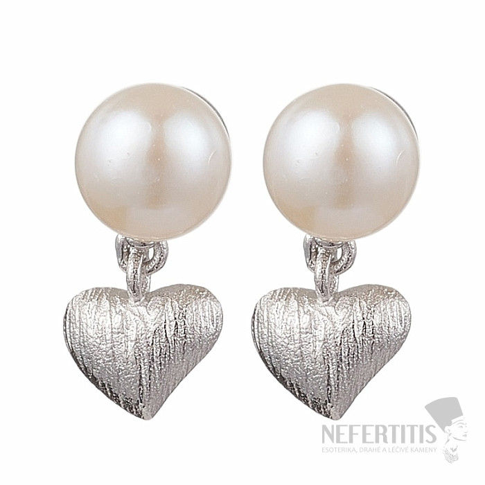 These silver earrings with a pearl and a delicate heart are a symbol of love, purity and feminine elegance. They are made of 925/1000 sterling silver and their delicate design combines the timeless beauty of a natural pearl with a romantic heart motif. Pearl diameter approx. 6.3 cm, earring length approx. 1.4 cm. Illustrative image.