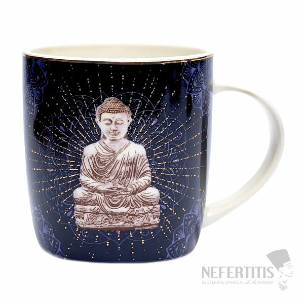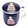 Attractive bone china cup, with stainless steel strainer - Meditating Buddha, expressing concentration and stability. Treat yourself to your favorite tea ritual, enjoy your favorite tea from a beautiful cup at home or in the office. Material: bone china, volume approx. 400 ml. Illustrative illustration.