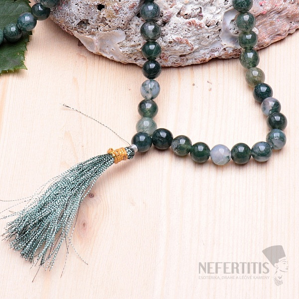 Beautiful, traditional Tibetan Japa Mala necklace made of moss agate beads to calm the mind, suppress stress and tension, suitable for meditation . The number of beads with a size of about 8 mm is 108, length about 84 cm. The illustrative depiction of the product made of natural material, the composition, color and drawing of the beads may differ from the accompanying photographs.