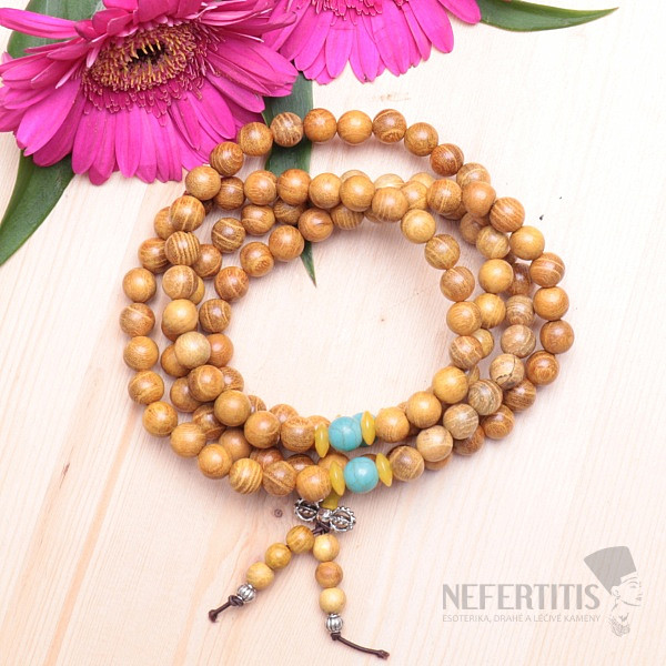 Honey brown traditional Japa Mala necklace made of sandalwood beads with its distinctive pattern, for calming the mind, reducing stress and tension, suitable for meditation. The teacher's ball, symbolizing wisdom, is decorated with a metal dorge, a ritual scepter, a "flash of enlightenment". The necklace is decorated with turquoise beads, which enhances the induction of calm, harmony and helps suppress stress and tension. Beads of approx. 8 mm are strung on a high-quality elastic band, the base is made of base metal, length approx. 84 cm.