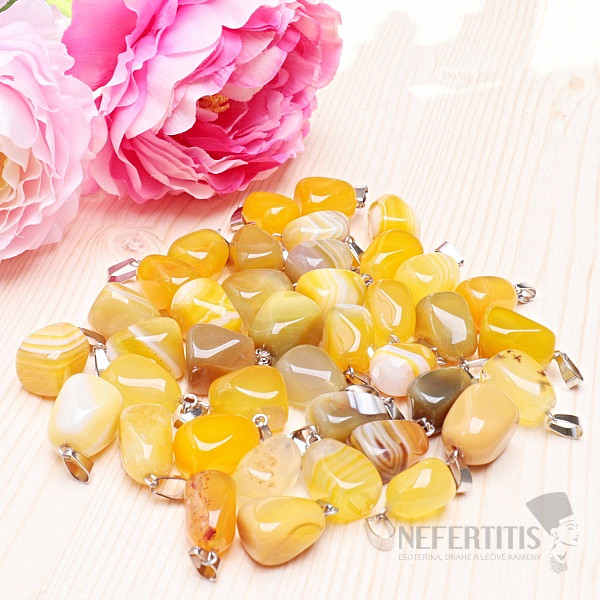 Pendant made of tambled yellow agate, with a handle of base metal. Stone size approx. 1.5 to 1.8 cm without fixed and hanging eyelet. Illustrative depiction , individual pendants can differ significantly from it, especially in color, structure and drawing of the stone.