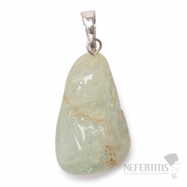A pendant made of beautiful blue tumbled aquamarine, with a handle made of base metal. Stone size approx. 1.6 to 2.3 cm without fixed and hanging loop. Illustrative image , individual pendants differ significantly from it mainly in color shade, structure and pattern of the stone.