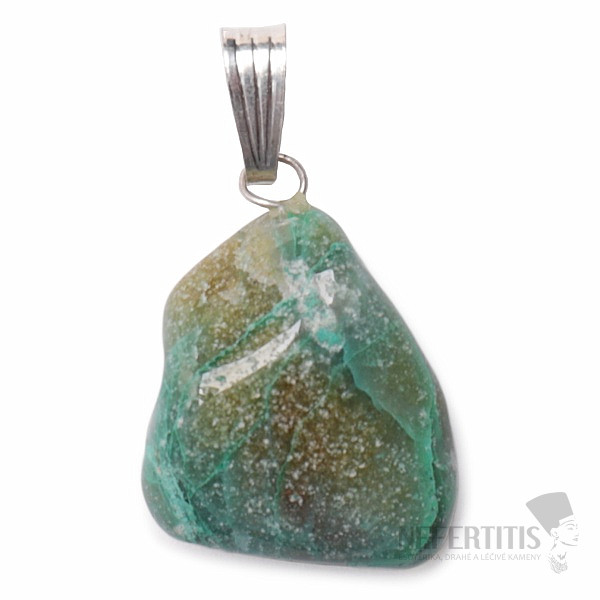 Pendant made of tambled chrysocol, with base metal handle. Stone size approx. 1.7 to 2.4 cm without fixed and hanging eyelet. Illustrative depiction , individual pendants differ significantly from it, especially in color, structure and drawing of the stone.