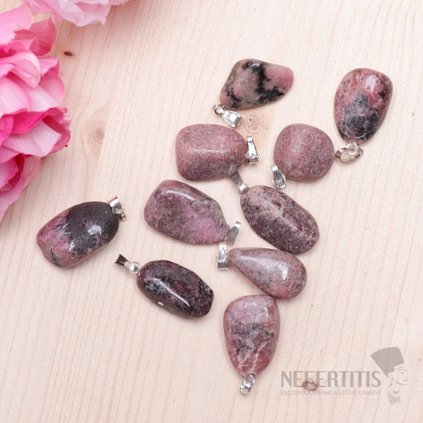Pendant made of beautiful tambled rhodonite, with a handle made of base metal. Stone size approx. 1.5 to 2.1 cm without fixed and hanging eyelet. Illustrative depiction , individual pendants differ significantly from it, especially in color, structure and drawing of the stone.