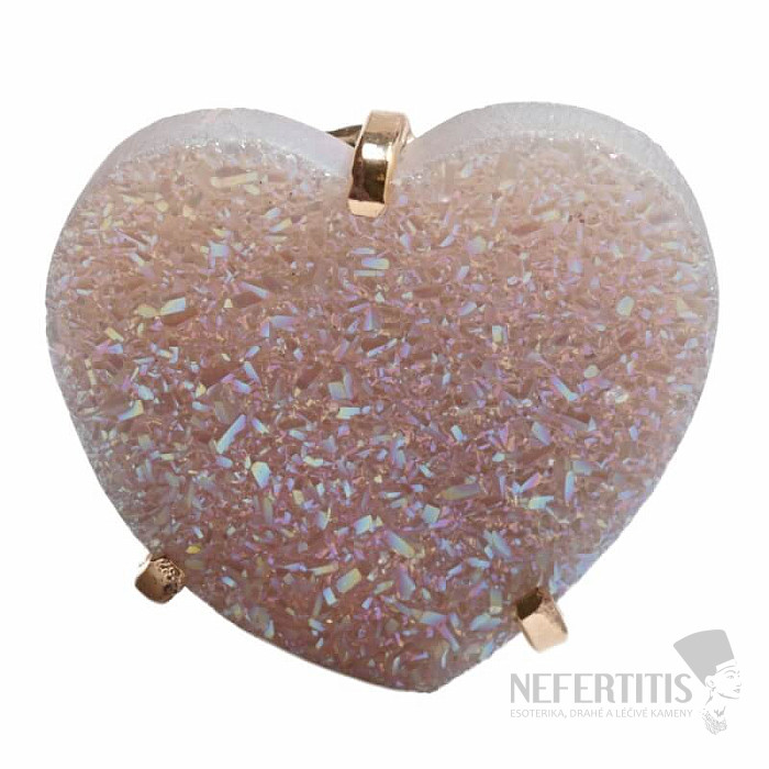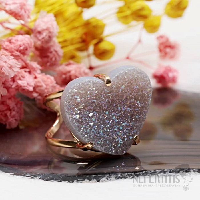 Discover the magic of elegance with this gold-plated ring, whose dominant feature is a heart-shaped agate druse with an aqua aura effect, which is created by applying a thin layer of metal. The druse shimmers beautifully. Each stone is original. Agate is a stone of protection, strength and harmony and will perfectly emphasize your personality. Material: natural stone, gold-plated brass. You are purchasing the ring shown.