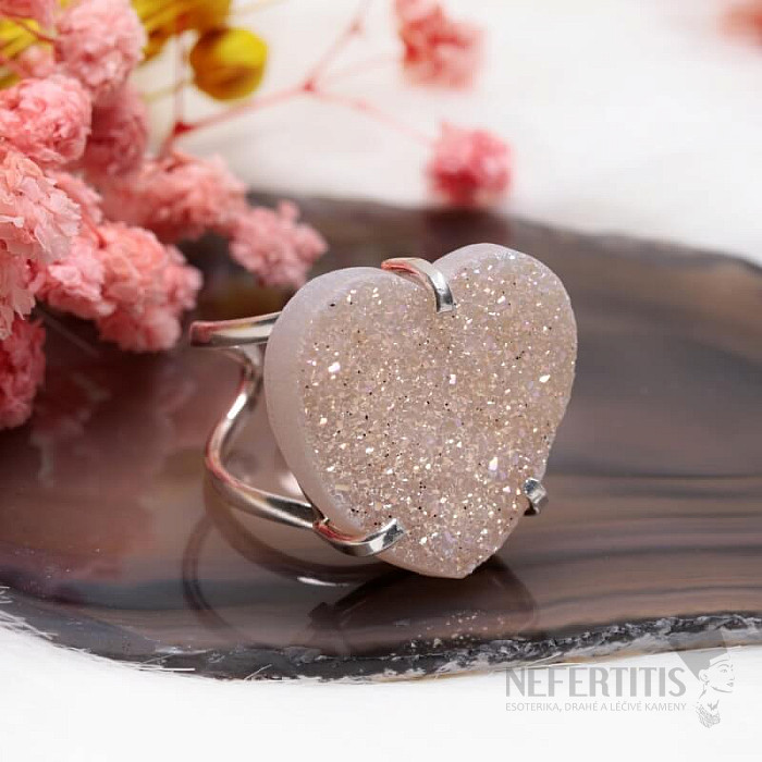 Discover the magic of elegance with this silver-plated ring, whose dominant feature is a heart-shaped agate druse with an aqua aura effect, which is created by applying a thin layer of metal. The druse shimmers beautifully. Each stone is original. Agate is a stone of protection, strength and harmony and will perfectly emphasize your personality. Material: natural stone, silver-plated brass. You are purchasing the ring shown.