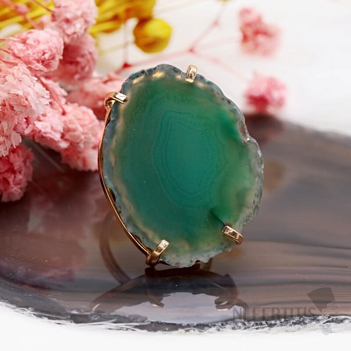 Discover the charm of elegance with this gold-plated ring, dominated by a large slice of agate. Each stone is original. Agate is a stone of protection, strength and harmony and will perfectly emphasize your personality. Material: natural stone, gold-plated brass. You are purchasing the ring shown.