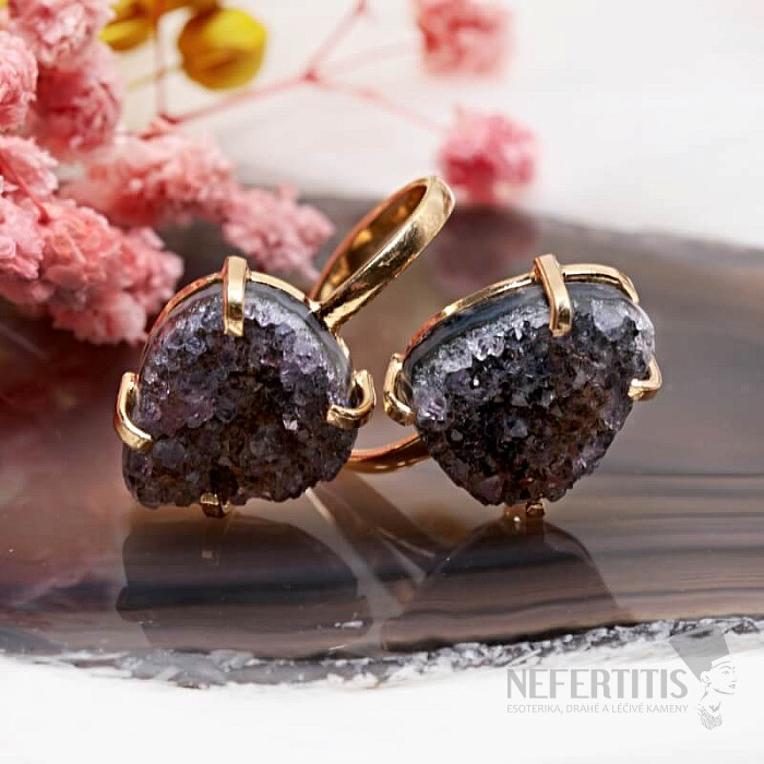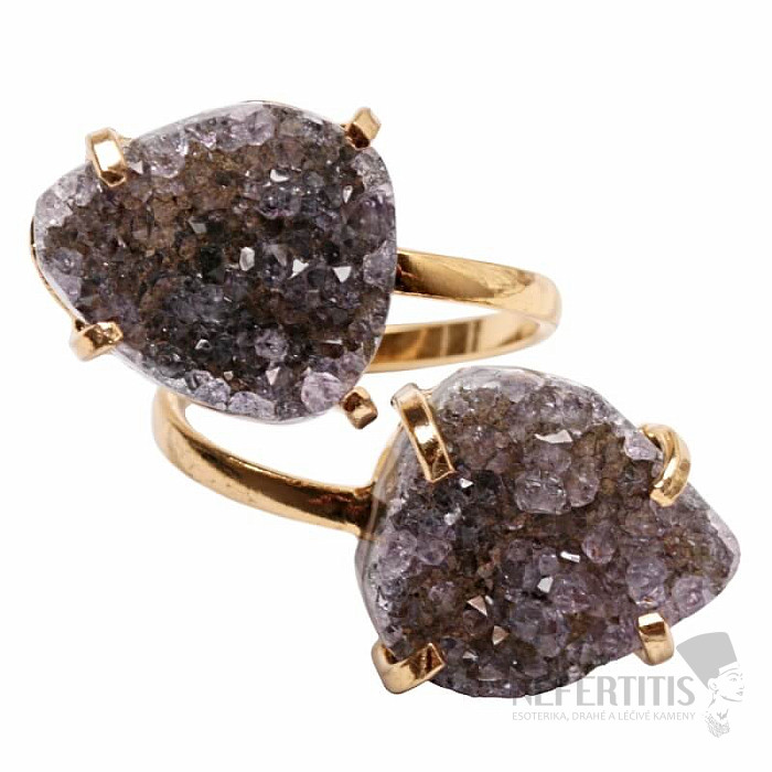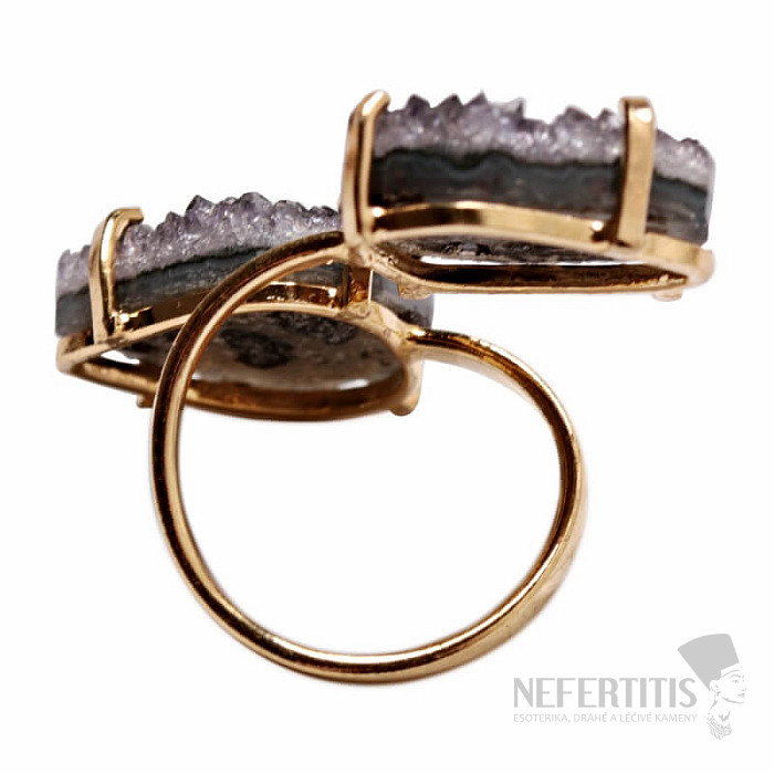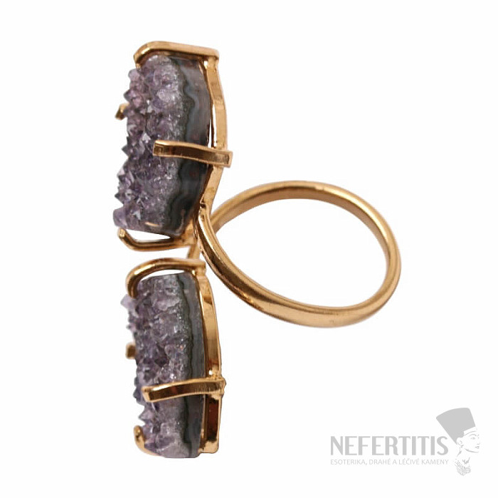 Discover the charm of gentle elegance with this gold-plated ring, dominated by two amethyst druses. Each stone is original. The ring is a celebration of feminine beauty and individuality. Amethyst is a stone of passion, love and understanding. Material: natural stone, gold-plated brass. You are purchasing the ring pictured.