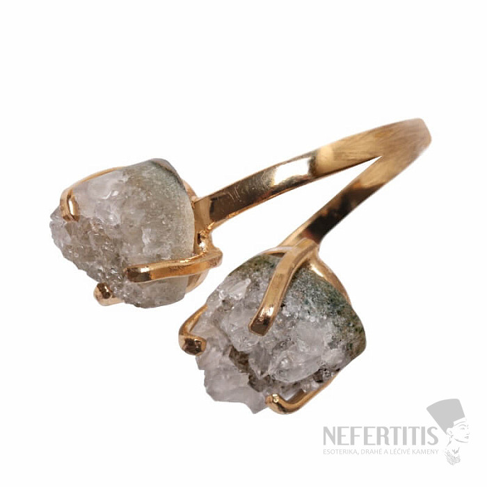 Discover the charm of gentle elegance with this gold-plated ring, dominated by two amethyst druses. Each stone is original. The ring is a celebration of feminine beauty and individuality. Amethyst is a stone of passion, love and understanding. Material: natural stone, gold-plated brass. You are purchasing the ring pictured.