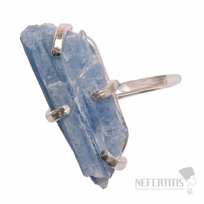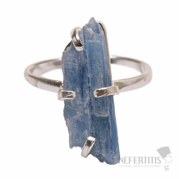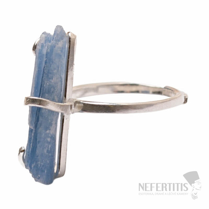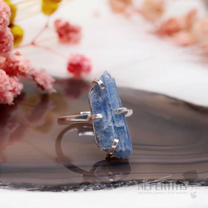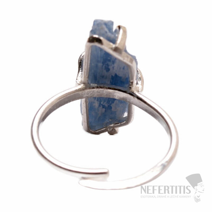 Discover the charm of elegance with this silver-plated ring, dominated by raw blue kyanite. Each stone is original. Kyanite is a stone that carries the calm of deep water, it is known as a stone of inner balance, communication and mental purity. Material: natural stone, silver-plated brass. You are purchasing the ring pictured.