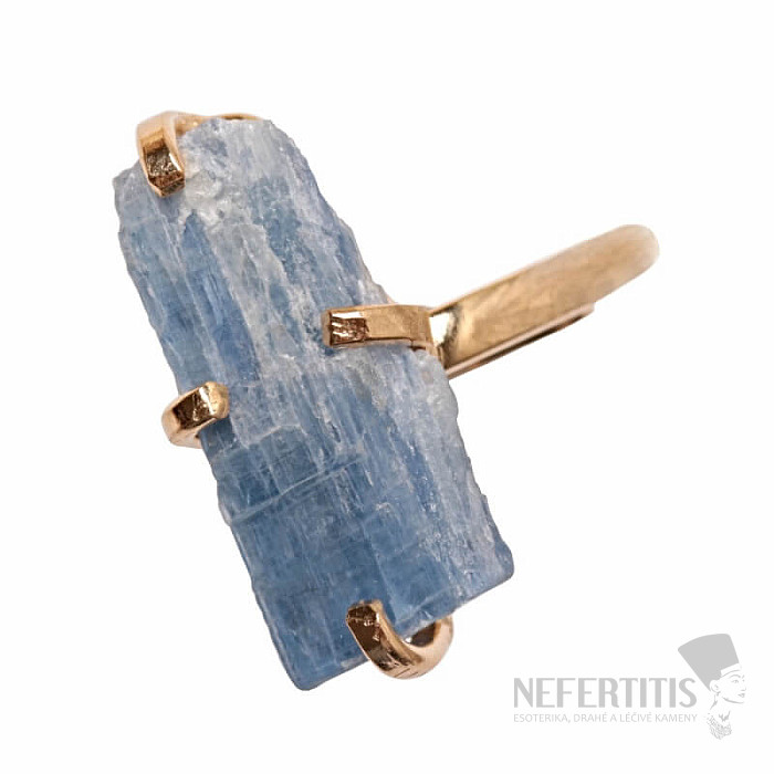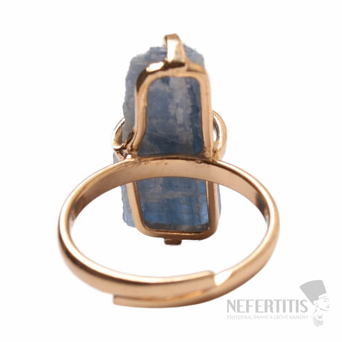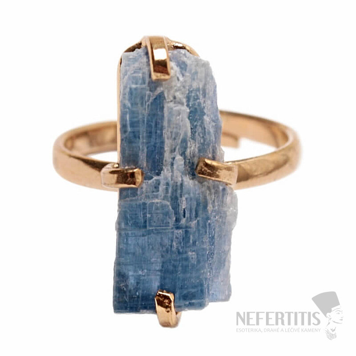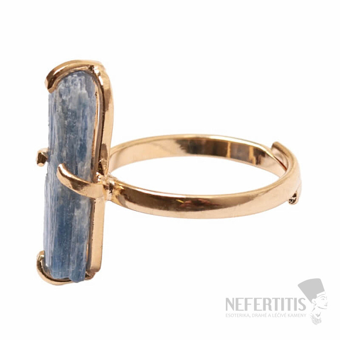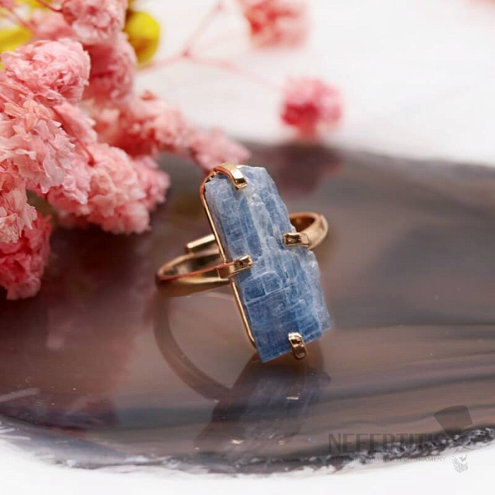 Discover the charm of elegance with this gold-plated ring, dominated by raw blue kyanite. Each stone is original. Kyanite is a stone that carries the calm of deep water, it is known as a stone of inner balance, communication and mental purity. Material: natural stone, silver-plated brass. You are purchasing the ring pictured.