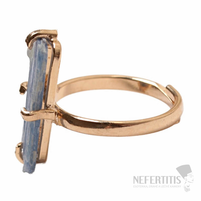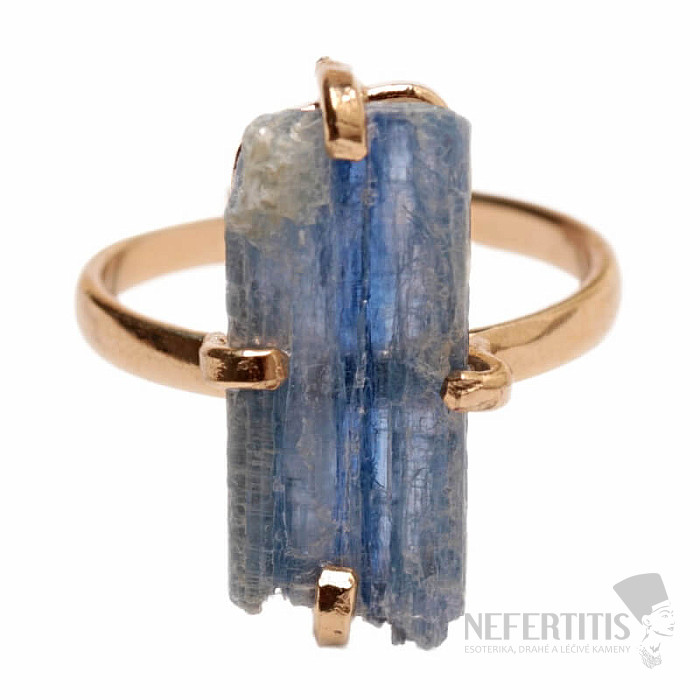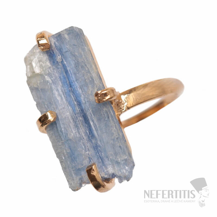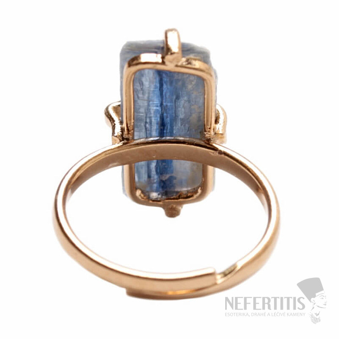 Discover the charm of elegance with this gold-plated ring, dominated by raw blue kyanite. Each stone is original. Kyanite is a stone that carries the calm of deep water, it is known as a stone of inner balance, communication and mental purity. Material: natural stone, silver-plated brass. You are purchasing the ring pictured.