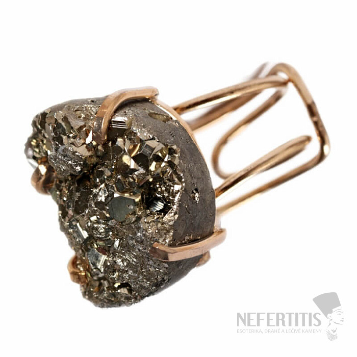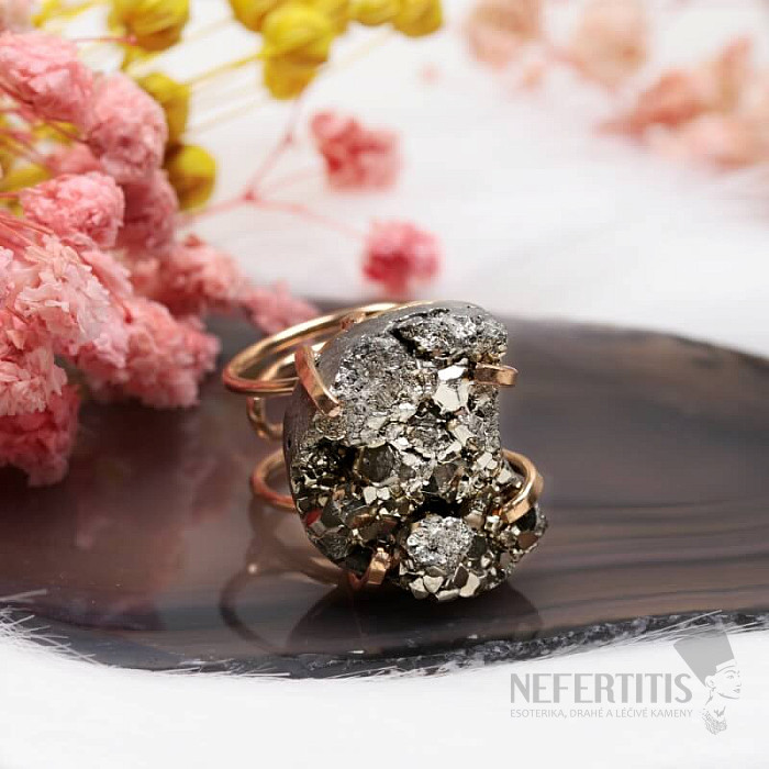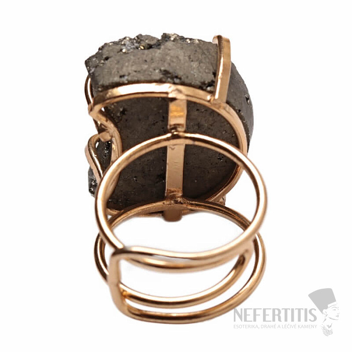 Discover the magic of elegance with this gold-plated ring with a shimmering pyrite druse. The metallic golden shine of pyrite resembles gold, but unlike it, it appears wild and unbridled. Each stone is original. Pyrite is a stone of protection, vitality and abundance . It supports inner strength, healthy self-confidence and determination. It is a stone of action, stability and courage. Material: natural stone, silver-plated brass. You are purchasing the jewelry shown directly.