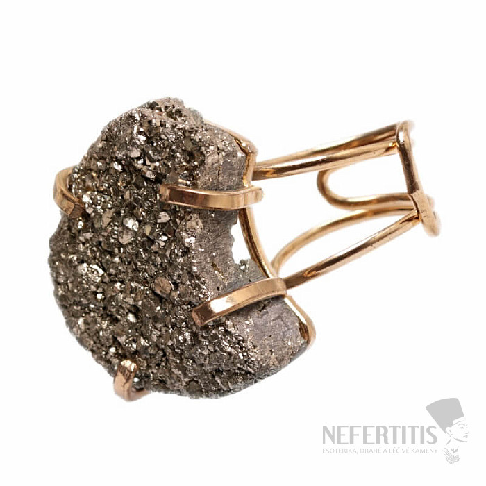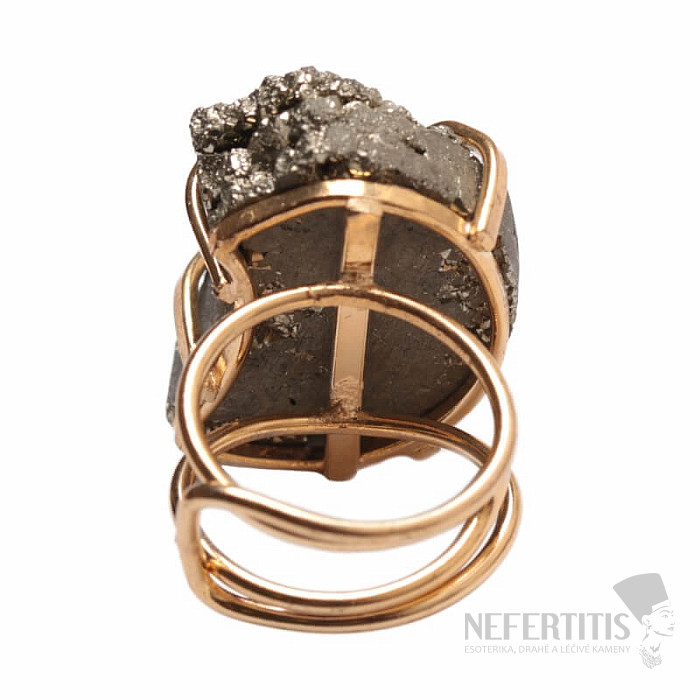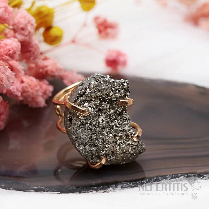 Discover the magic of elegance with this gold-plated ring with a shimmering pyrite druse. The metallic golden shine of pyrite resembles gold, but unlike it, it appears wild and unbridled. Each stone is original. Pyrite is a stone of protection, vitality and abundance . It supports inner strength, healthy self-confidence and determination. It is a stone of action, stability and courage. Material: natural stone, silver-plated brass. You are purchasing the jewelry shown directly.