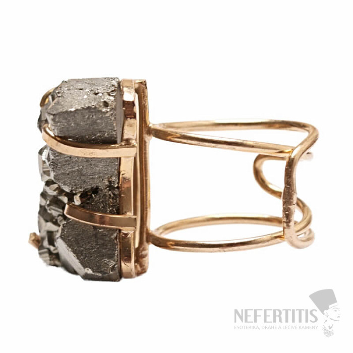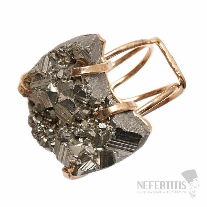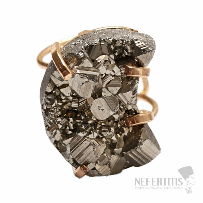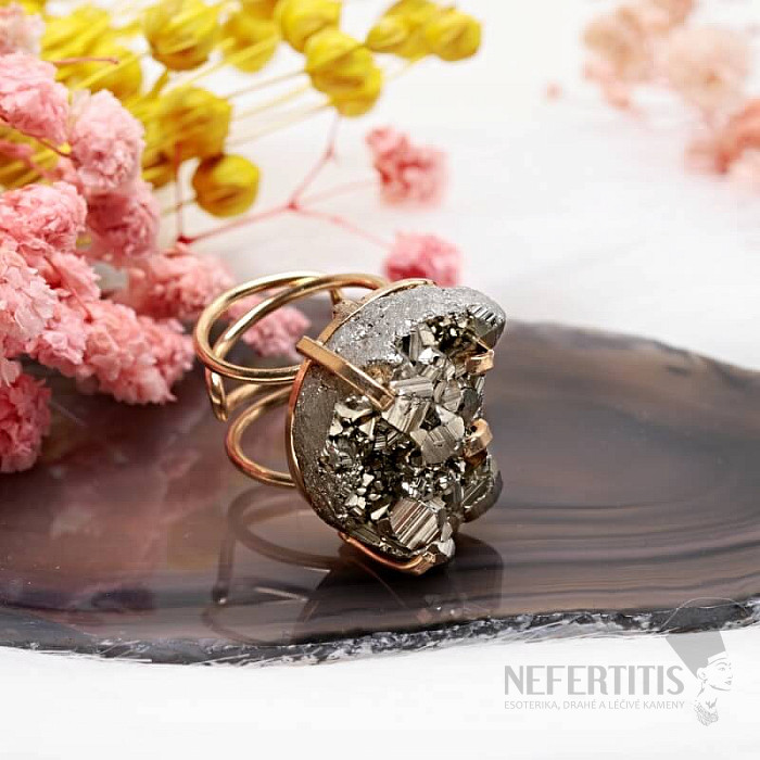 Discover the magic of elegance with this gold-plated ring with a shimmering pyrite druse. The metallic golden shine of pyrite resembles gold, but unlike it, it appears wild and unbridled. Each stone is original. Pyrite is a stone of protection, vitality and abundance . It supports inner strength, healthy self-confidence and determination. It is a stone of action, stability and courage. Material: natural stone, silver-plated brass. You are purchasing the jewelry shown directly.