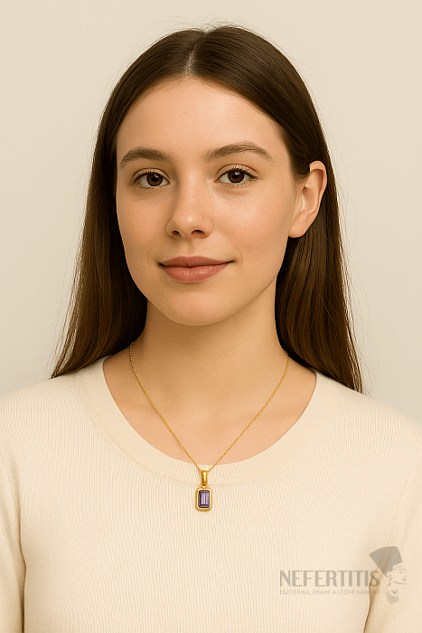 This elegant pendant made of 925/1000 sterling silver is coated with a layer of 14k gold, which gives it a warm, luxurious look. The main element is a natural amethyst measuring approximately 7 mm, set in a rectangular bezel and cut with a high-quality emerald (step) cut , which highlights its purple hues and clarity.