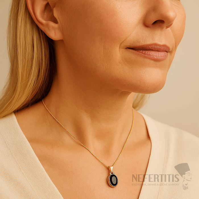 The dominant feature of the pendant is a natural black spinel measuring approximately 8 mm , cut into an oval shape with a high-quality facet cut , which creates subtle reflections and gives the stone depth and elegance.