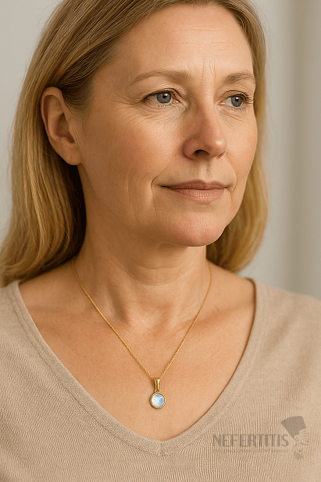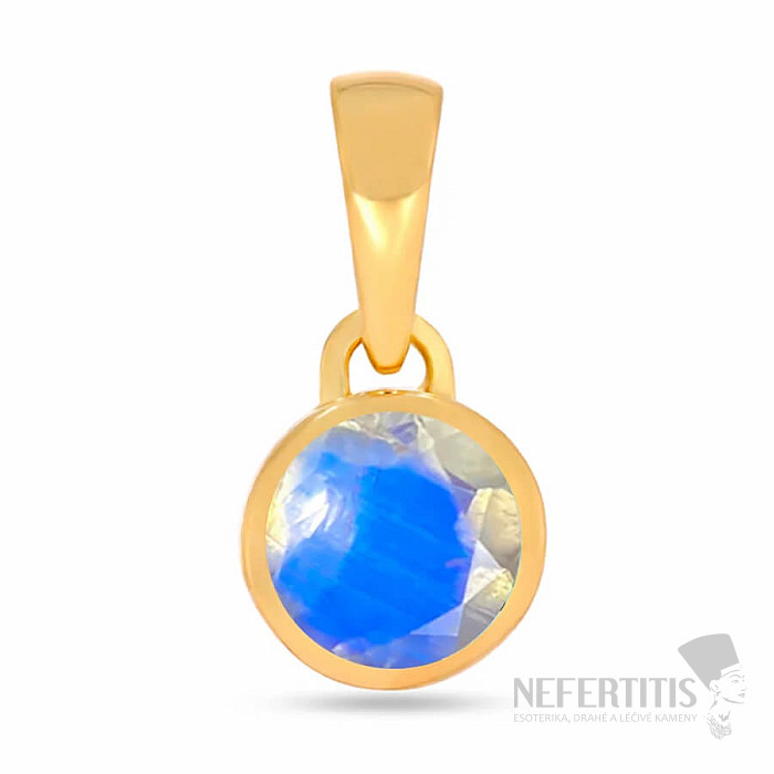This delicate pendant from the Concetta collection is made of high-quality 925/1000 silver with a thick layer of 14k gold plating , which gives the jewelry a warm and luxurious tone. The dominant feature is a natural rainbow moonstone measuring approximately 5 mm in size, cut into a perfectly round shape with a facet cut. It is this cut that contributes to its typical optical effect - a subtle bluish to rainbow glow, known as adularescence.
