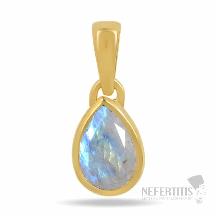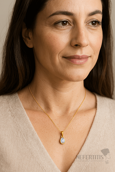 This delicate gold-plated pendant from the Concetta collection is made of genuine 925/1000 silver , covered with a layer of 14k gold, which gives it a warm, luxurious shade. The dominant feature of the jewelry is a natural rainbow moonstone measuring approximately 5 mm, cut into an elegant teardrop shape with a facet cut . This emphasizes its characteristic play of colors - delicate blue, white and rainbow reflections, which make the jewel unique and lively.