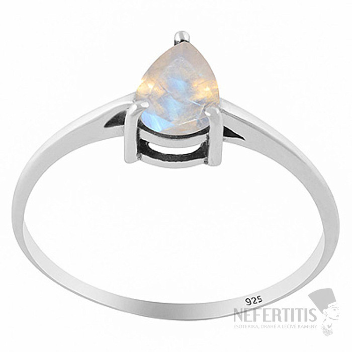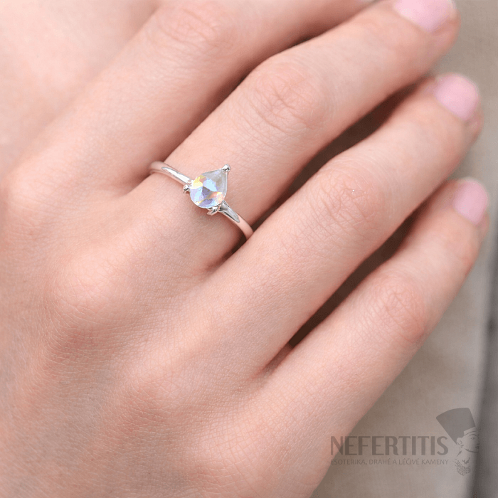 The dominant feature of the ring is a natural moonstone measuring approximately 7 mm, cut into a pear shape with a precise facet cut , which highlights its typical optical effect – a subtle rainbow glow (adularescence).
