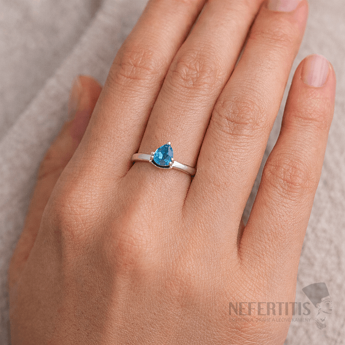 The dominant feature of the ring is a Swiss Blue topaz measuring approximately 6 mm, cut into a pear shape with a precise facet cut that maximizes its sparkle and brightness.